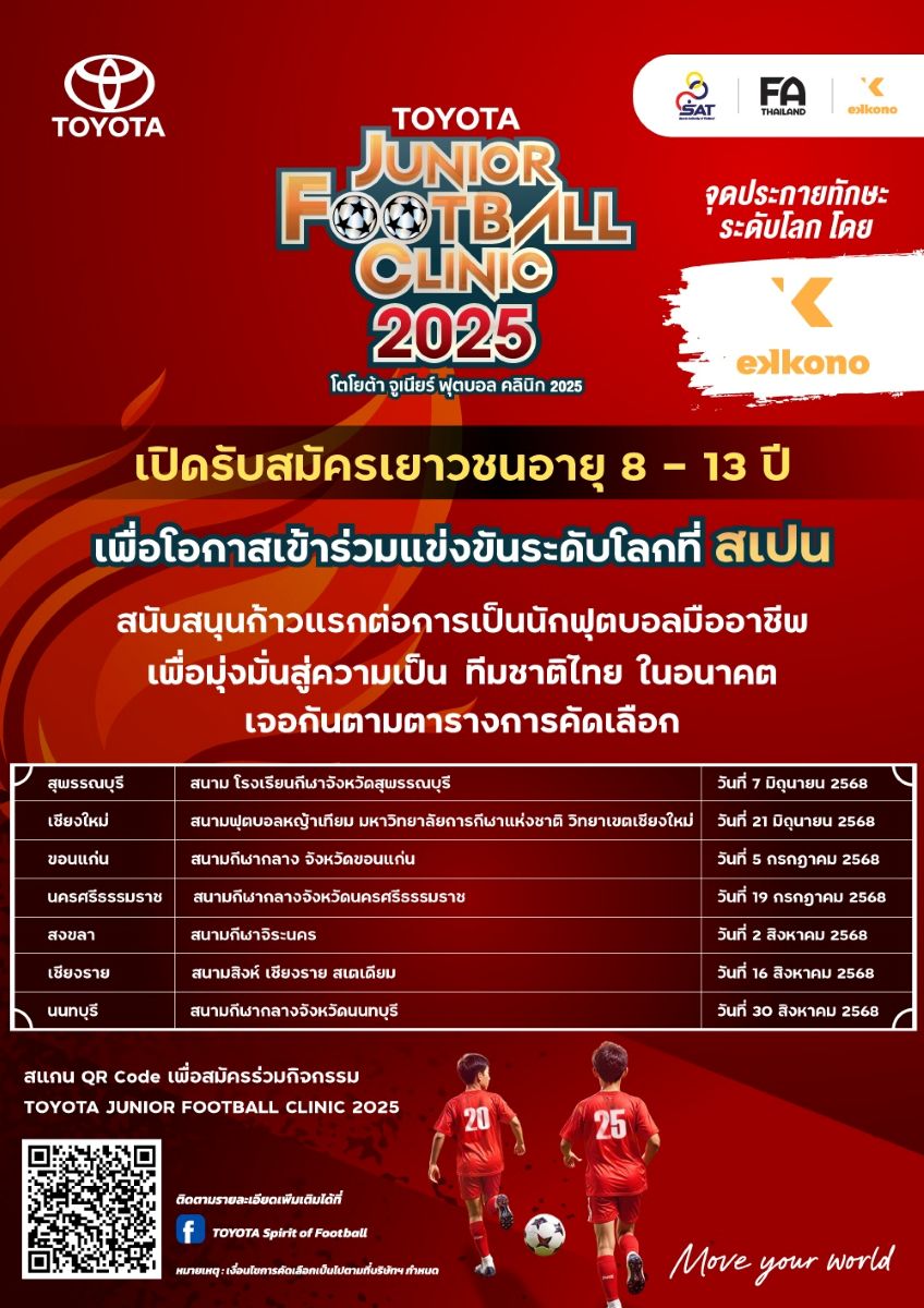 โตโยต้าขอเชิญชวนเยาวชนไทยที่มีความฝันสู่เส้นทางฟุตบอลอาชีพ เข้าร่วมการแข่งขันคัดเลือกนักเตะในโครงการ “TOYOTA Junior Football Clinic 2025” ซึ่งเปิดโอกาสให้เยาวชนอายุ 8-13 ปี จากทั่วประเทศได้แสดงศักยภาพและพัฒนาทักษะฟุตบอลภายใต้การฝึกสอนของโค้ชระดับโลกจาก EKKONO Academy โดยสามารถสมัครได้ที่ผู้แทนจำหน่ายโตโยต้า ในจังหวัดที่รับสมัคร ตั้งแต่วันที่ 12 พฤษภาคม 2568 เป็นต้นไป และอีกช่องทางที่รับสมัครพร้อมติดตามความเคลื่อนไหวได้ที่ Facebook page : Toyota Spirit of Football https://www.facebook.com/ToyotaFootball