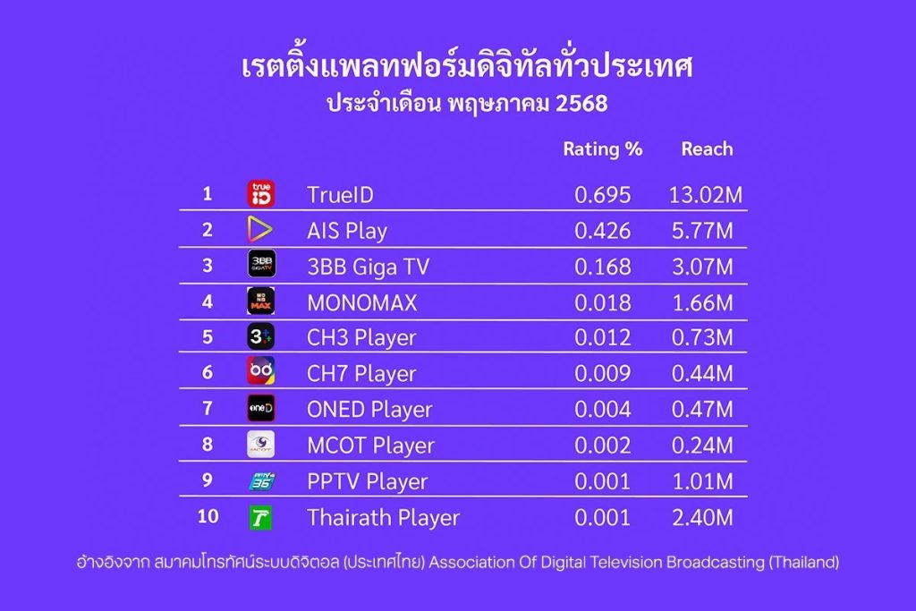 ล่าสุด รายงานข้อมูล การวัดเรตติ้งข้ามแพลตฟอร์ม (Cross-Platform Ratings) จากสมาคมโทรทัศน์ระบบดิจิตอล (ประเทศไทย) หรือ ADTEB ประจำเดือน พฤษภาคม 2568 ได้เปิดเผยอันดับเรตติ้งของแพลตฟอร์มดิจิทัลทั่วประเทศ โดย TrueID คือแพลตฟอร์มไทยผู้ครองตำแหน่ง อันดับ 1 ด้วยเรตติ้ง 0.695% และยอดเข้าถึงผู้ชม (Reach) สูงถึง 13.02 ล้านคน ทิ้งห่างแพลตฟอร์มอันดับ 2 และ 3 กว่าเท่าตัว