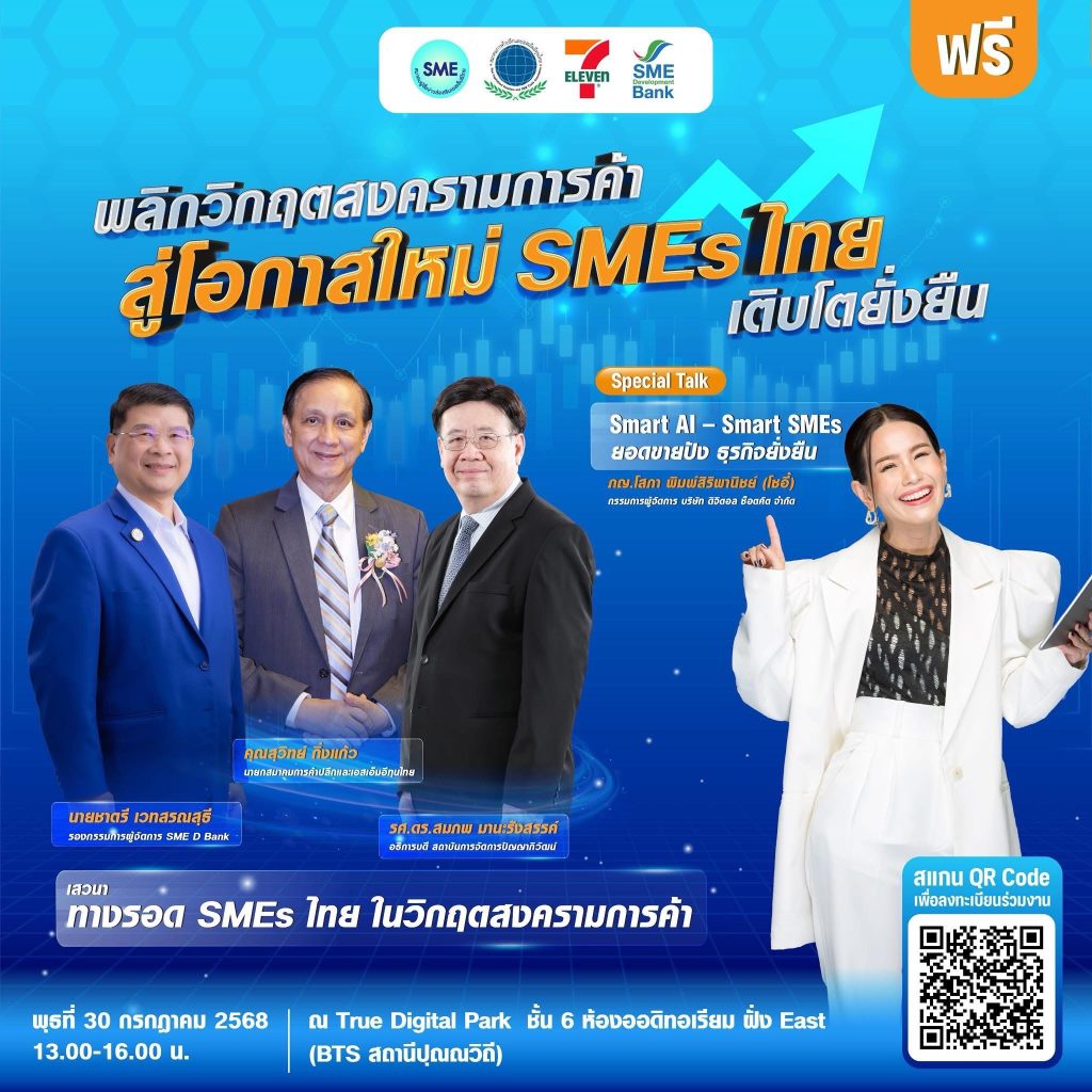 สมาคมผู้สื่อข่าวส่งเสริมเอสเอ็มอีไทย ร่วมกับ สมาคมการค้าปลีกและเอสเอ็มอีทุนไทย และภาคีเครือข่าย ธนาคารพัฒนาวิสาหกิจขนาดกลางและขนาดย่อมแห่งประเทศไทย หรือ SME D Bank และ ร้านสะดวกซื้อ 7-11 จัดงานสัมมนาหัวข้อ “พลิกวิกฤตสงครามการค้า สู่โอกาสใหม่ SMEs ไทยเติบโตอย่างยั่งยืน” เพื่อให้ผู้ประกอบการไทยเข้าใจแนวโน้มธุรกิจในช่วงวิกฤตและหาโอกาสเติบโตอย่างมั่นคงในยุคดิจิทัล โดยจะพูดถึงกลยุทธ์รับมือกับความท้าทายจากสงครามการค้า รวมถึงเทคโนโลยี AI ที่ช่วยสร้างการเติบโตทางธุรกิจอย่างยั่งยืน ในวันพุธที่ 30 กรกฎาคม 2568 เวลา 13.00-16.00 น. ณ True Digital Park ชั้น 6 ห้องออดิทอเรียม ฝั่ง East (BTS สถานีปุณณวิถี)