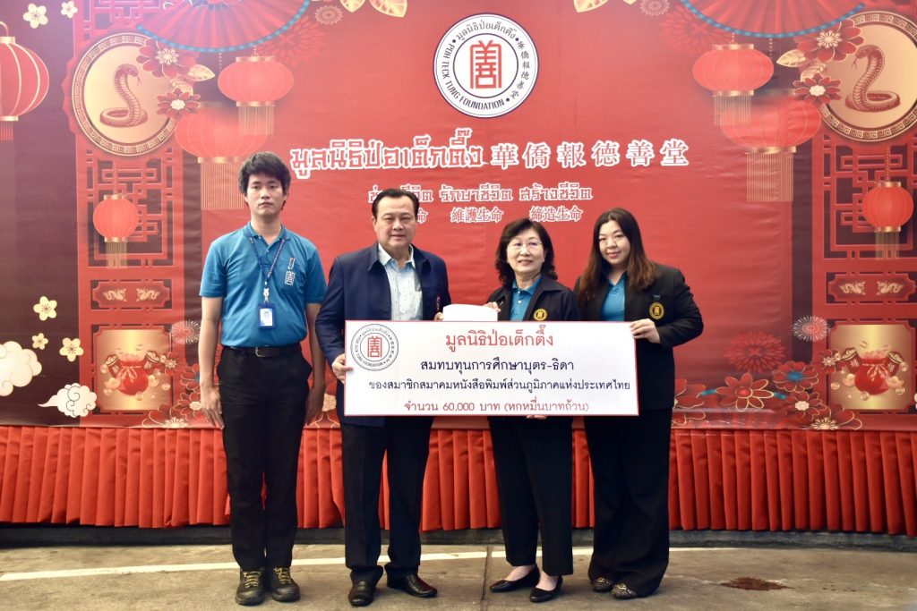 เมื่อเวลา 10.00 น. วันพุธที่ 13 สิงหาคม 2568 ณ มูลนิธิป่อเต็กตึ๊ง พลับพลาไชย กรุงเทพฯ คุณดวงชุตา ติยะพจนพรกุล ผู้ช่วยผู้จัดการฝ่ายสังคมสงเคราะห์ มูลนิธิป่อเต็กตึ๊ง พร้อมด้วย คุณศุภรัตน์ สมบัติเจริญไทย หัวหน้าแผนกส่งเสริมการศึกษาและอาชีพ ฝ่ายสังคมสงเคราะห์ มูลนิธิป่อเต็กตึ๊ง เป็นผู้แทนมูลนิธิฯ มอบทุนการศึกษาจำนวน 60,000 บาท ให้แก่สมาคมหนังสือพิมพ์ส่วนภูมิภาคแห่งประเทศไทย (สภท.60ปี) โดยมี นายอนันต์ นิลมานนท์ นายกสมาคมฯ เป็นผู้รับมอบ เพื่อมอบเป็นทุนการศึกษาให้กับบุตร-ธิดา สมาชิกสมาคมฯ ในการประชุมใหญ่สามัญประจำปี ที่จะมีขึ้นในวันที่ 22-23 สิงหาคม 2568 ที่ Cross Vibe Bangkok Srinakarin (โรงแรมคิงปาร์ค อเวนิว) ถ.ศรีนครินทร์ 40 กรุงเทพฯ