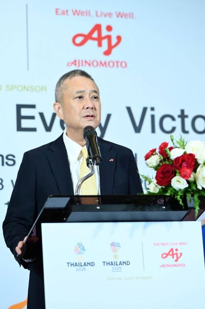 มร.อิชิโระ ซะกะกุระ กล่าวว่า กลุ่มบริษัท อายิโนะโมะโต๊ะ มีเกียรติประวัติอันยาวนานและความมุ่งมั่นอย่างแท้จริงในการสนับสนุนภูมิภาคอาเซียน เราภูมิใจที่ได้เป็นผู้สนับสนุนหลักอย่างเป็นทางการในการแข่งขันซีเกมส์ ครั้งที่ 33 และอาเซียนพาราเกมส์ ครั้งที่ 13 ซึ่งไม่ได้เป็นเพียงมหกรรมกีฬาที่ยิ่งใหญ่เท่านั้น แต่ยังเป็นสัญลักษณ์อันทรงคุณค่าที่สะท้อนถึงแพชชั่น ความทุ่มเท และความเป็นอันหนึ่งอันเดียวกัน ซึ่งถักทอสายสัมพันธ์ของผู้คนในภูมิภาคนี้ การสนับสนุนของเราครอบคลุมด้านโภชนาการแก่สมาคมกีฬา นักกีฬา รวมไปจนถึงสถาบันกีฬาในหลายประเทศภายใต้โครงการ ASEAN Victory Project อาเซียน วิคตอรี โปรเจ็ค