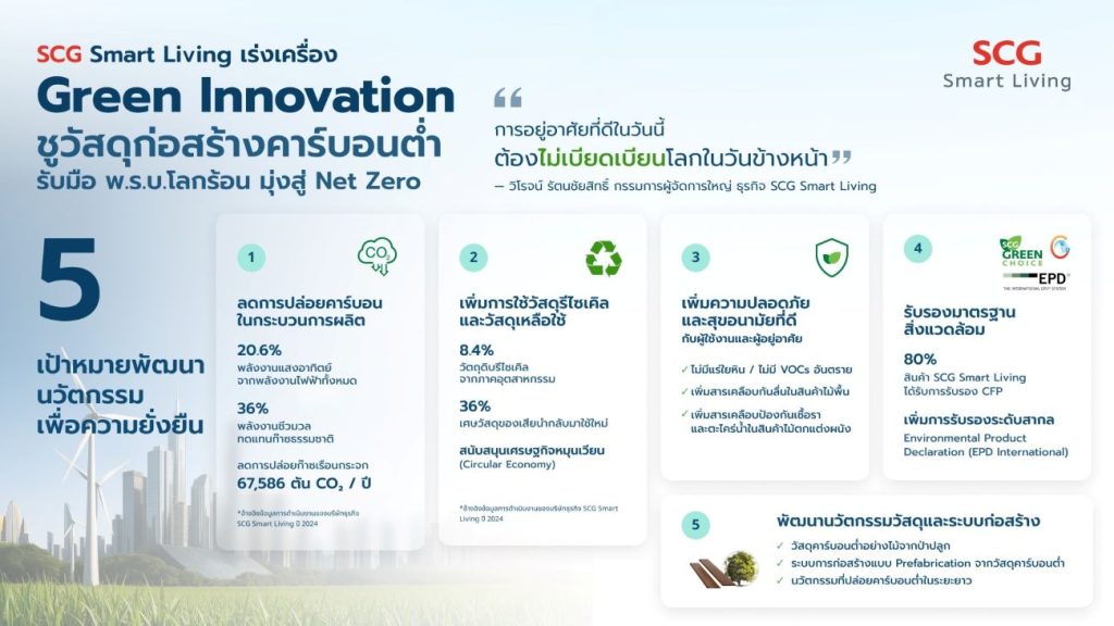 SCG Smart Living เร่งเครื่อง “Green Innovation” ชูสินค้าวัสดุก่อสร้างคาร์บอนต่ำ รองรับ พ.ร.บ. โลกร้อน มุ่งสู่เป้าหมายการปล่อยก๊าซเรือนกระจกสุทธิเป็นศูนย์