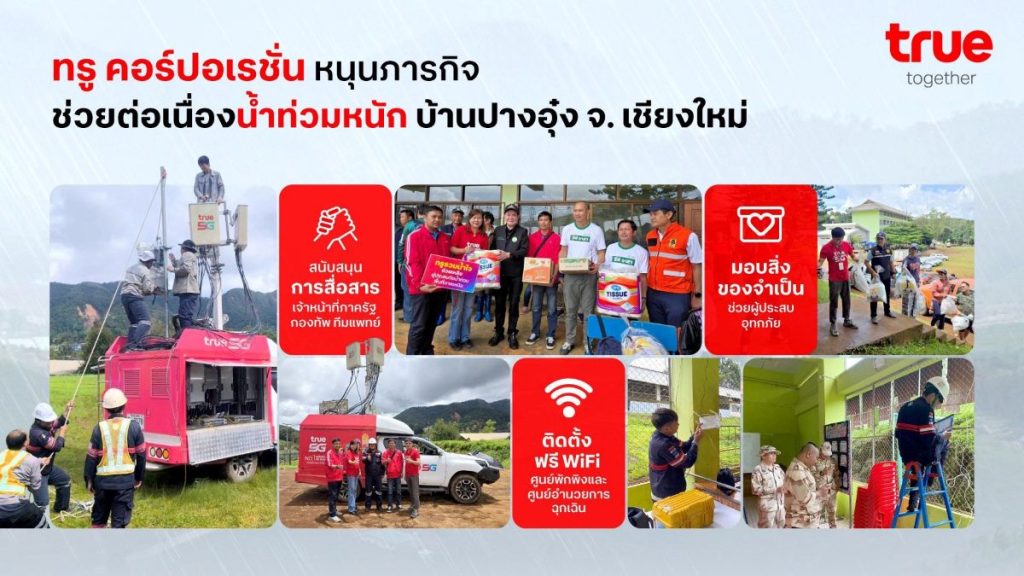ทรู คอร์ปอเรชั่น หนุนภารกิจช่วยน้ำท่วมปางอุ๋งต่อเนื่อง ติดตั้งฟรี WiFi ครอบคลุมศูนย์พักพิงและศูนย์อำนวยการฉุกเฉิน พร้อมมอบสิ่งของจำเป็นช่วยผู้ประสบอุทกภัย และสนับสนุนการสื่อสารทีมเจ้าหน้าที่ภาครัฐ กองทัพ ทีมแพทย์