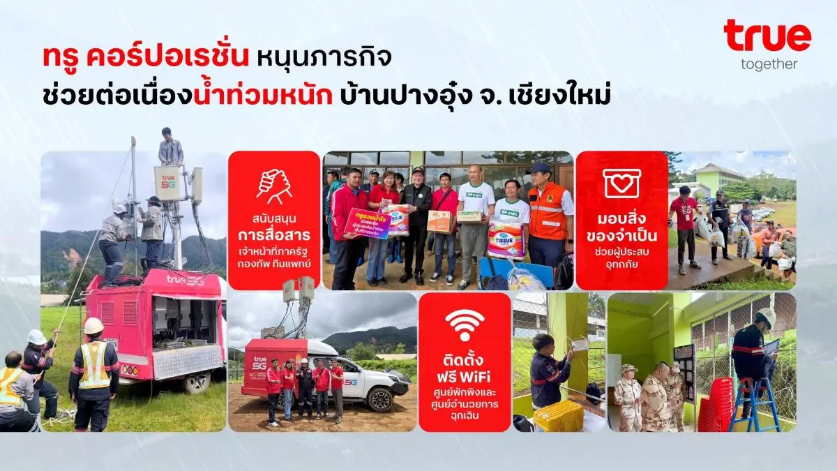 2 กันยายน 2568 – ทรู คอร์ปอเรชั่น เดินหน้าสนับสนุนภารกิจด้านการสื่อสารในสถานการณ์อุทกภัยที่ปางอุ๋ง จังหวัดเชียงใหม่ โดยติดตั้งจุดให้บริการฟรี WiFi ครอบคลุมทั้งศูนย์พักพิงชั่วคราว อบต.แม่ศึก โรงเรียนปางอุ๋ง และ ศูนย์อำนวยการฉุกเฉินช่วยเหลือผู้ประสบอุทกภัย อำเภอแม่แจ่ม จ.เชียงใหม่ เปิดให้บริการตลอด 24 ชั่วโมง รองรับการใช้งานทุกเครือข่ายมือถือฟรี เพื่อให้ประชาชนที่อพยพเข้ามาพักพิงมากกว่า 130 คน รวมถึงเจ้าหน้าที่ แพทย์ และพยาบาลสามารถติดต่อสื่อสารได้อย่างสะดวกและต่อเนื่อง พร้อมทั้งส่งมอบสิ่งของจำเป็นและอาหารแห้งเพื่อบรรเทาความเดือดร้อนแก่ผู้ประสบภัยในศูนย์พักพิง