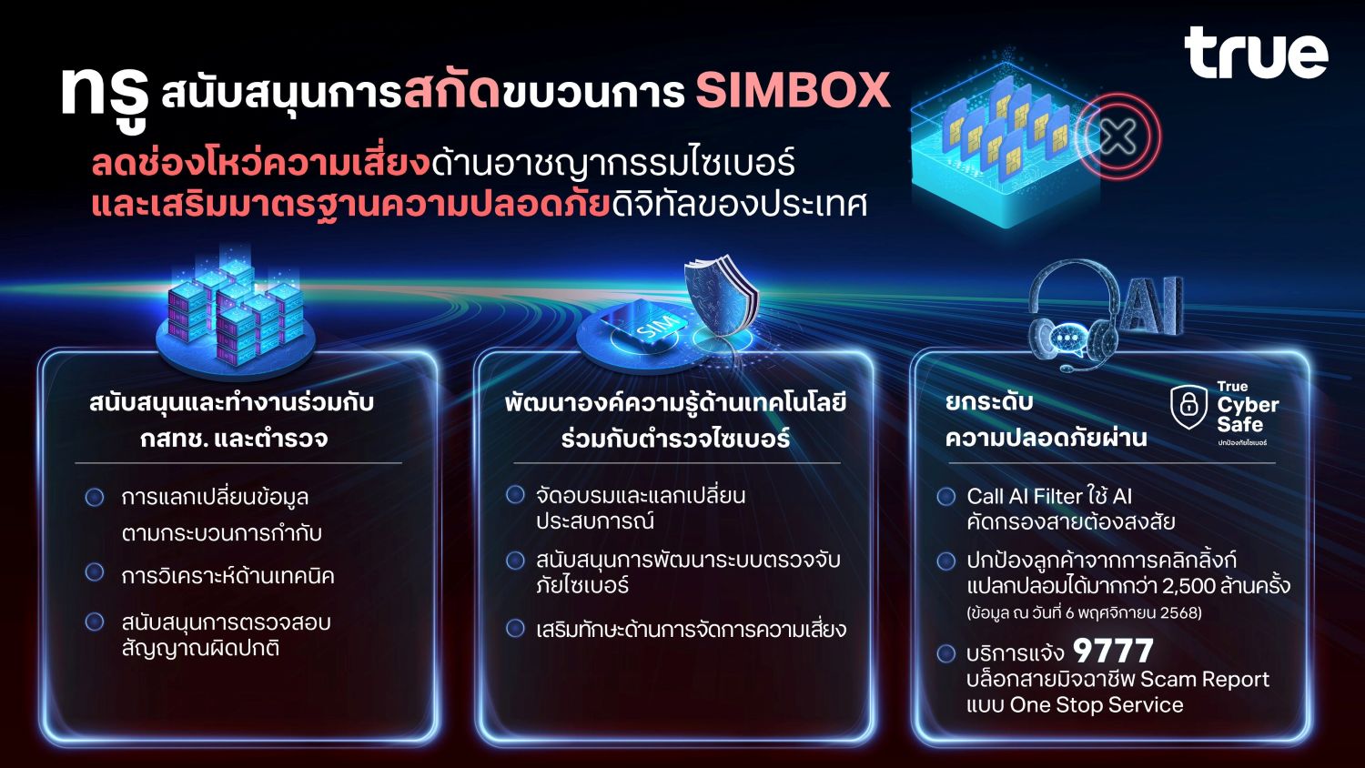 ที่ผ่านมา ทรู มุ่งมั่นสกัดกั้นกลโกงมิจฉาชีพที่ซับซ้อนและเปลี่ยนรูปแบบตลอดเวลา ควบคู่กับการยกระดับความปลอดภัยผ่าน True CyberSafe เกราะป้องกันภัยดิจิทัลสำหรับลูกค้าด้วยบริการ Call AI Filter คัดกรองสายต้องสงสัยด้วย AI และช่วยปกป้องลูกค้าจากการคลิกลิ้งก์แปลกปลอมไปแล้วกว่า 2,531,905,914 ล้านครั้ง (ข้อมูล ณ วันที่ 6 พฤศจิกายน 2568) นอกจากนี้ยังมีบริการแจ้ง 9777 บล็อกสายมิจฉาชีพ Scam Report แบบ One Stop Service ให้ประชาชนแจ้งบล็อกสายต้องสงสัยได้ทันที พร้อมผสานส่งต่อข้อมูลให้เจ้าหน้าที่ตำรวจอย่างรวดเร็ว ความร่วมมือครั้งนี้ ตอกย้ำการทำงานเชิงรุกร่วมกับทุกภาคส่วนแบบไร้รอยต่อ ปิดทางโทรหลอกลวงและเสริมสร้างความปลอดภัยทางดิจิทัลของประเทศอย่างต่อเนื่อง