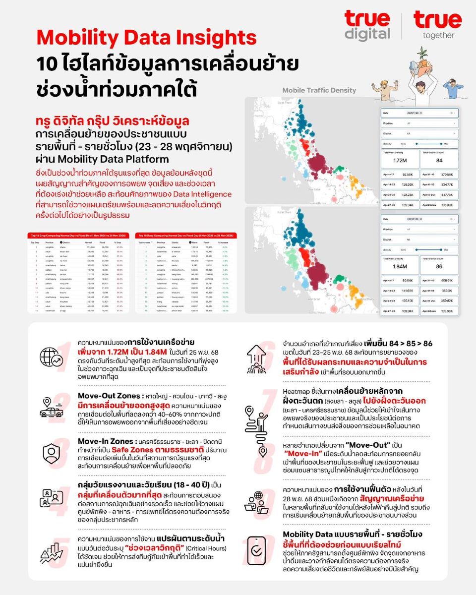 ทรู คอร์ปอเรชั่น ผสานพลังเครือข่ายทรู 5G และเทคโนโลยีดิจิทัล ส่ง Mobility Data Platform วิเคราะห์ข้อมูลการเคลื่อนตัวของประชากรแบบเรียลไทม์ หนุนภาครัฐช่วยผู้ประสบภัยน้ำท่วมภาคใต้ ฟื้นฟูพื้นที่ได้ตรงจุด รวดเร็ว และมีประสิทธิภาพ