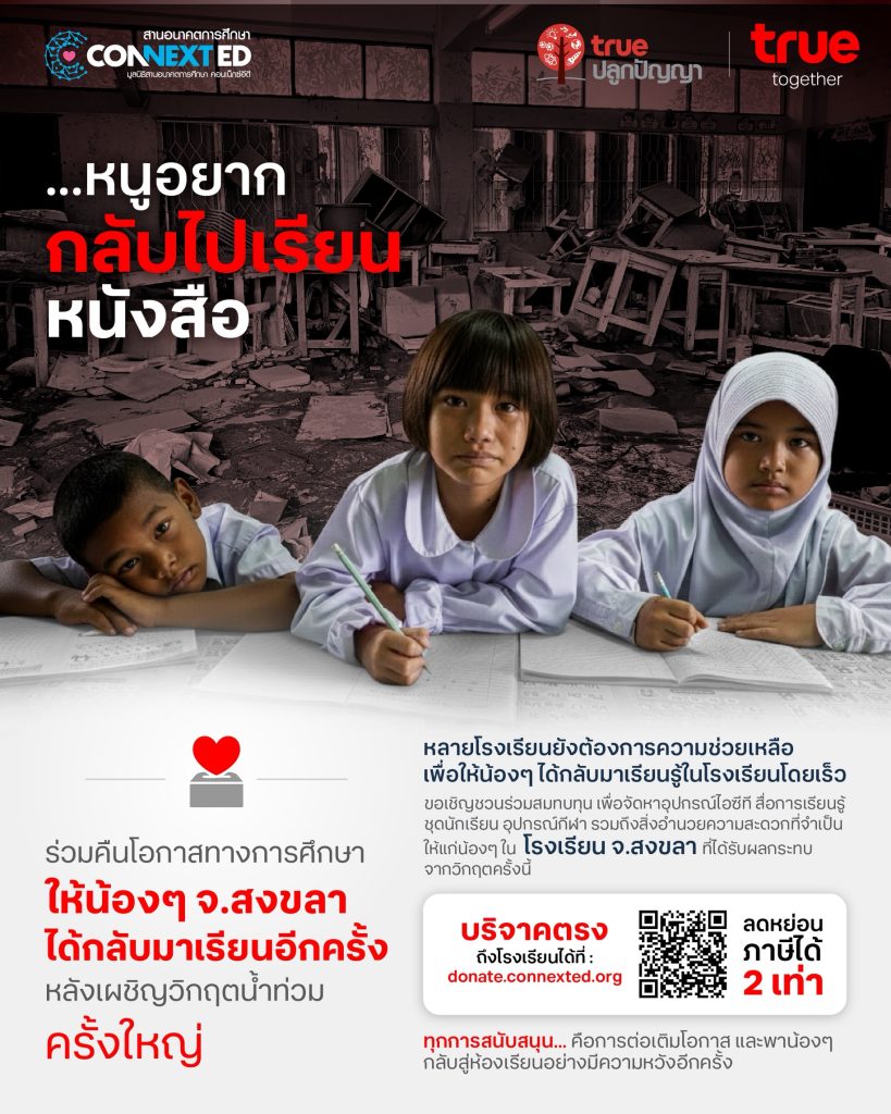 คืนอนาคตที่สดใส พาน้องๆ กลับไปเรียนหนังสือกันอีกครั้ง…ทรู คอร์ปอเรชั่น x มูลนิธิสานอนาคตการศึกษา คอนเน็กซ์อีดี ชวนระดมทุนเพื่อการศึกษา ฟื้นฟูโรงเรียน จ.สงขลา จากวิกฤตน้ำท่วม ลดหย่อนภาษีได้ 2 เท่า