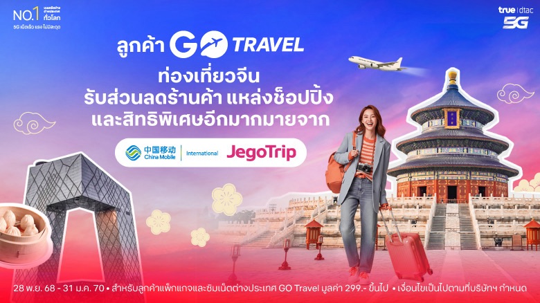 กรุงเทพฯ 18 ธันวาคม 2568 – GO Travel ชวนลุยจีนแบบปัง!…ทรู เดินหน้ายกระดับประสบการณ์ท่องเที่ยวของลูกค้า GO Travel โดยร่วมกับ China Mobile International เพื่อมอบดีลพิเศษ จาก JegoTrip แพลตฟอร์มที่รวบรวมส่วนลดและสิทธิประโยชน์จากร้านค้า ห้างสรรพสินค้า สถานที่ท่องเที่ยวชั้นนำทั่วประเทศจีน และบริการจองตั๋วรถไฟความเร็วสูง ให้ลูกค้าสามารถกดรับดีลเพื่อเริ่มทริปได้อย่างคุ้มค่าตั้งแต่ก้าวแรกที่ถึงสนามบิน ไม่ว่าจะเป็นสายช้อป สายกิน หรือสายเที่ยวแบบลงคอนเทนต์ทุกมุม … GO Travel x JegoTrip พร้อมช่วยให้ทริปจีนสนุก คุ้ม และสะดวกยิ่งขึ้นในทุกเส้นทาง