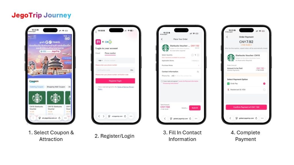 – สมัครหรือซื้อผ่านช่องทางการขายอื่น ๆ – เมื่อลูกค้าสมัครแพ็กเกจเน็ตต่างประเทศ GO Travel ราคา 299 บาทขึ้นไป หรือซื้อซิมเน็ตต่างประเทศ GO Travel SIM, GO Travel MyPlan eSIM จากนั้น ลูกค้าทรู กด USSD *868*3903# โทรออก , ลูกค้าดีแทค กด USSD *399*3903# โทรออก เมื่อทำรายการสำเร็จ ลูกค้าจะได้รับ SMS พร้อมลิงก์สำหรับเข้าสู่ JegoTrip เพื่อเลือกรับสิทธิพิเศษและส่วนลดจาก JegoTrip ที่ใช้ได้ในประเทศจีน
