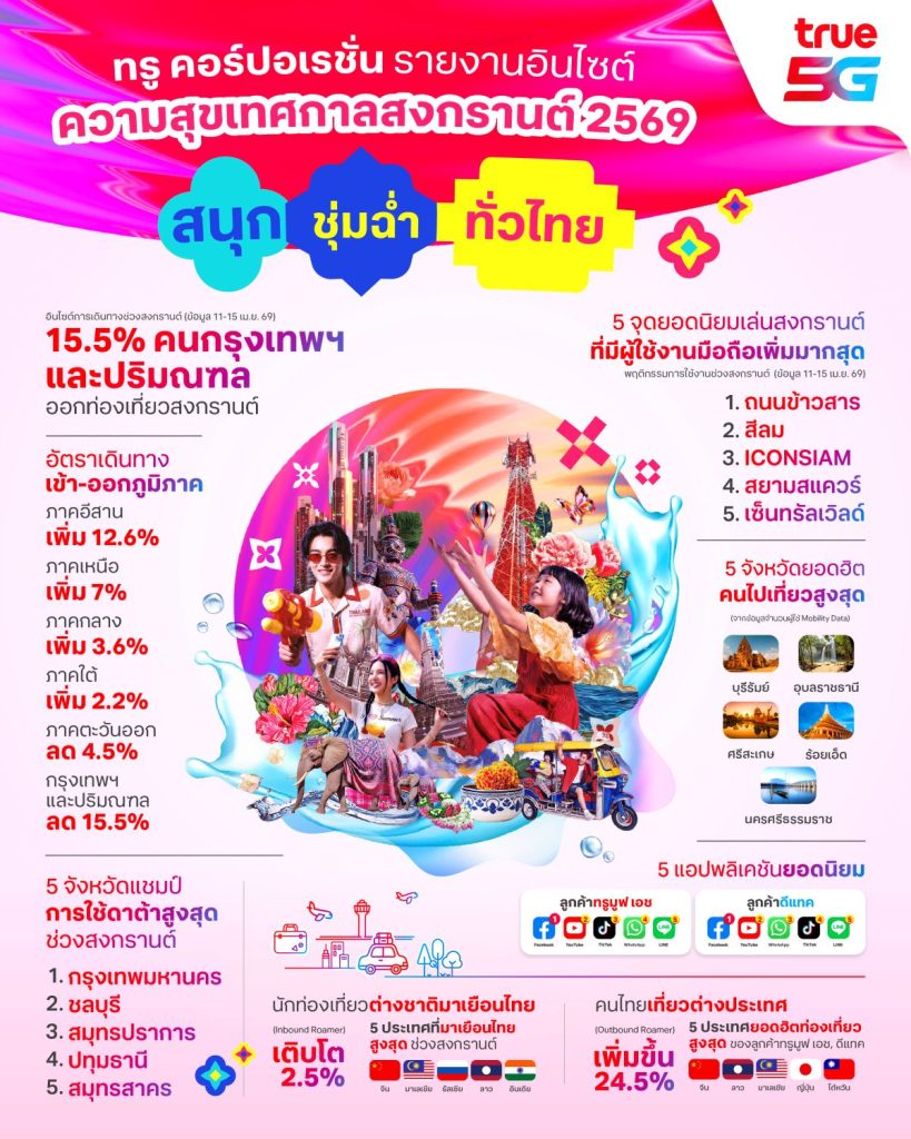 16 เมษายน 2569 – ทรู คอร์ปอเรชั่น เผยอินไซต์ “ความสุขเทศกาลสงกรานต์ 2569” ผ่านการวิเคราะห์ข้อมูล “Mobility Data” จากโครงข่ายอัจฉริยะที่ขับเคลื่อนด้วย AI สะท้อนพฤติกรรมการเดินทางและการใช้งานดิจิทัลของผู้บริโภคแบบเรียลไทม์ พบว่าเทศกาลปีนี้มีการเดินทางกระจายตัวมากขึ้นทั่วประเทศ โดยเฉพาะภูมิภาคอีสานที่เติบโตสูงสุด ขณะที่นักท่องเที่ยวต่างชาติยังคงเพิ่มขึ้นต่อเนื่อง โดยเฉพาะนักท่องเที่ยวจีนที่ครองอันดับหนึ่ง